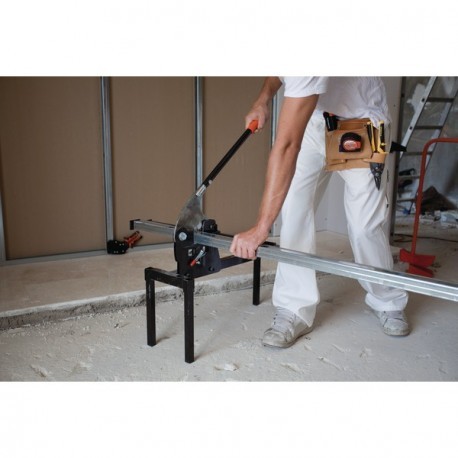 Platine revolver 4 matrices pour 6 formes de profilés métalliques : lisses, fourrures F 530, montants de 48 mm, rails de 48 mm, cornières d’angles, suspentes en T. Changement rapide des matrices. Tréteau de compensation permettant un positionnement optimal du profilé. Butée réglable pour coupe sur mesure. Permis au feu non nécessaire dans les zones sensibles car pas d’étincelle.